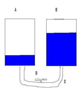 Todos vimos este ejemplo en el colegio: un recipiente A con poco líquido está unido por un tubo («C») a otro recipiente B con mucho líquido. Hay un grifo, válvula o canilla («D»). ¿Qué pasa si la abren?. Pues pasará líquido de B a A…. ¿hasta donde?. Hasta que ambos se nivelen. Pues bien, eso pasó con sus campos energéticos mientras estaban charlando con el amigo o pariente conflictuado. Naturalmente, sin necesaria «animosidad», los campos áuricos, entremezclados (pues recuerden que la segunda capa áurica se extiende entre 50 y 70 cm, y la tercera, extremadamente sutil, según algunos autores hasta dos o tres metros) se «nivelarán» como el líquido del ejemplo. Así, su amigo, que llegó devitalizado energéticamente se va sintiéndose mejor, pues ha «subido su nivel»…. a cambio de descender el de ustedes, que por eso quedan «planchados».